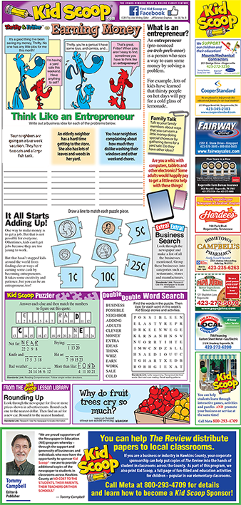 Campbell, Publisher of the Rogersville Review gives an in-depth testimonial to the benefits of publishing Kids Scoop™. The page and screenshot samples are also from the Review.